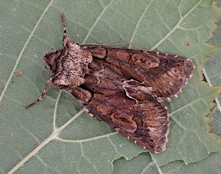 Common in broad-leaved woodland, scrub, hedgerows and gardens throughout the British Isles, a species of conservation concern under the UK Biodiversity Action Plan. In Hampshire and on the Isle of Wight widely distributed, but not particularly common. Wingspan 38-48 mm. Occurs in two forms, and their intermediates, in any shade on a scale from green to brown, but always easy to recognise and unlike any other British moth. Larva feeds on Hawthorn and Blackthorn and, less frequently, other broad-leaved trees and shrubs.