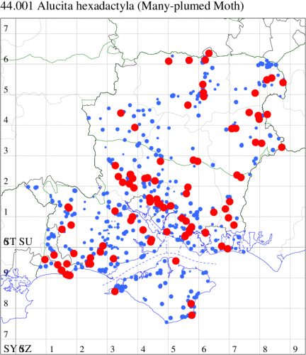 Common in gardens and open woodland throughout the British Isles. Fairly well distributed in Hampshire and the Isle of Wight. Wingspan 13-16 mm. Combination of size and plumed fore- and hindwings, with each divided into six plumes, is unique. Larva feeds on buds and leaves of Honeysuckle and Perfoliate Honeysuckle.