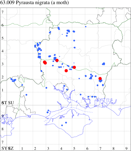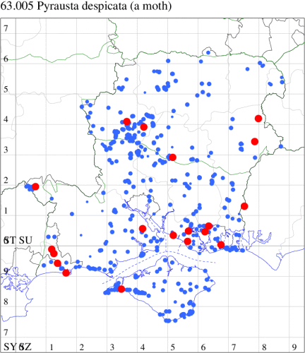 Local, on sand-dunes, dry heathland, downland and open areas on chalk or limestone, throughout the British Isles. Widespread in Hampshire and Wight. Wingspan 14-19mm. Forewing more mottled and less clearly marked than in any other British Pyrausta species [Goater]. Flies both by day and night. Larva feeds on Ribwort and Greater Plantain, forming silken galleries.