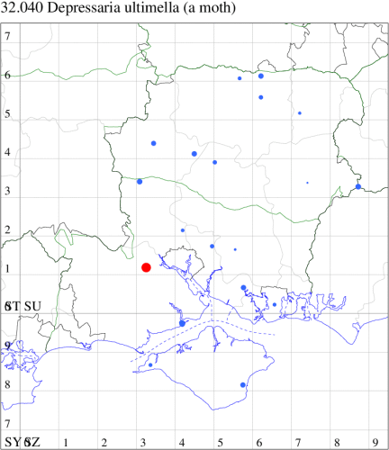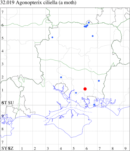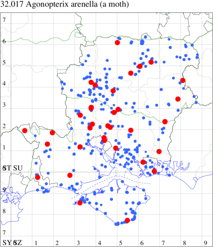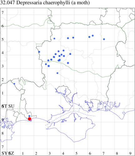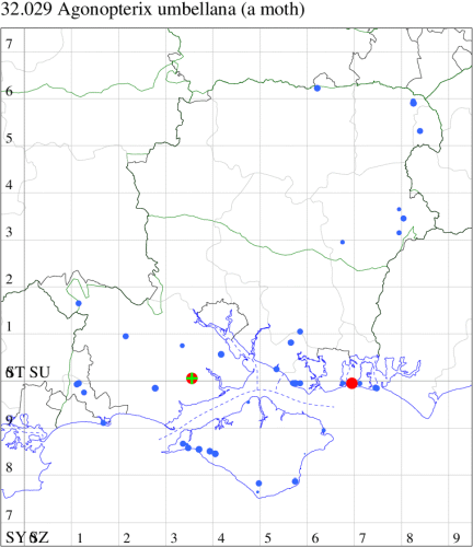 VC11: Woodlands, NF, one, 31 Jul (RBW); Stanbridge Earls, one, 16 Mar (JRM); Romsey, two, 16 Mar (NRJ); Wildern LNR, Hedge End, larva, two, field obs., on Hemlock Water Dropwort, 22 Jun (TCrw); Titchfield Haven NNR, larva, one, field obs., 09 Jun (PBarf); Botley Wood, two, worn, det gen, 15 Mar (F.M.G. det. RJD); Stubbington, larva, two, field obs., in spinnings on Hemlock Water-dropwort, 17 May (DPH); Funtley, two, 10 Feb; four, 14 Feb; four, 15 Feb; four, 16 Mar; one, 07 May; one, 09 May; one, 11 May (TDC); Botley Wood, larva, one, field obs., 16 Jun (DPH); Claylands LNR, Bishop's Waltham, larva, present, field obs., on Hemlock water-dropwort, 31 May; Bishop's Waltham, larva, present, field obs., 08 Jun (DTru); Waterlooville, one, 03 Apr (DWhe); St Clair's Meadow NR, Droxford, larval spinning, present, field obs., spinnings and larvae on hemlock water dropwort, , 03 Jun (RJD); Christchurch: Cross Way, one, 16 Feb; four, 27 Feb; three, 08 Mar; one, 10 Mar; four, 13 Mar; five, 17 Mar; two, 19 Mar; one, 20 Mar; one, 25 Mar (LPyk); Christchurch, three, 07 Apr (APard); Hengistbury Head NNR, one, 28 May (MJef); one, 11 Jul (BKin det. MJef); one, 12 Jul (RPH); Hordle, one, field obs., 14 Mar; Sway, one, 11 Mar; one, 12 Mar; one, 13 Mar; one, 15 Mar; one, 11 Aug; one, indoors, 29 Feb 29 Feb (SKee); Pennington, two, 10 Feb; one, 15 Feb; one, 25 Mar; one, 05 Apr; one, 10 Aug (RFC); Keyhaven Marshes, larva, one, at dusk, larvae in spun flowers of Hemlock Water Dropwort, 08 Jun (WLan);