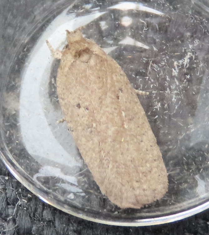Nationally scarce (Nb) in woodland and hedgerows in parts of England, except the north-east, and in north Wales. A scarcely seen insect in Hampshire with a very scattered distribution, mainly away from the chalk; there are two old records from the Isle of Wight. Wingspan 11-14 mm. The three pale, evenly-spaced spots on each forewing make this a distinctive member of the Oecophoridae. Larva feeds on dead wood, perhaps most frequently of Hazel.