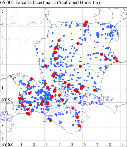 Common in woodland, especially of birch, heathland and gardens throughout Britain. Widespread and common in Hampshire and on the Isle of Wight. Wingspan male 36-40 mm, female 40-43 mm. In Scotland moths are distinctly straw-coloured with outer markings darker (ssp. scotica), elsewhere, occasional individuals can be very pale (f. pallida), but only likely to be confused with Dusky Hook-tip D. curvatula, a rare immigrant from Europe, which is darker and has the three discal spots roughly the same size (in falcataria, the outer discal spot is much larger then the other two). Larva feeds on Downy and Silver Birch, over-wintering as a pupa.