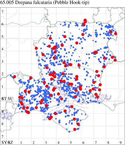 Rare immigrant from mainland Europe, appearing in southern and eastern England. First recorded at Dungeness, Kent, in August 1960. In Hampshire the UK's fifth record was discovered at Totton in August 1991. Recorded on the Isle of Wight for the first time at Freshwater in 2002. Wingspan male 37-40 mm, female 40-49 mm. Can easily be overlooked as a dark Pebble Hook-tip D. falcataria, but in that species the outer discal spot on the forewing is much larger than the other two, and on the hindwing the cross-lines in Pebble Hook-tip are more jagged and the wing is noticeably paler towards the costa (MBGBI Vol 7 part 2). Larva feeds on Silver Birch, Downy Birch, Alder and Oak, no evidence of breeding in the UK.