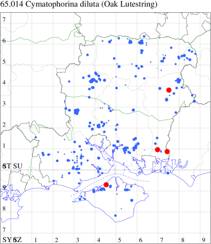 VC12: Upper Inhams Copse, Pamber Forest, two, 15 Feb; two, 10 Mar (GJD); Whitehill, Bordon, one, 08 Mar; one, 09 Mar; one, 11 Mar; one, 16 Mar (ASto); Hammer Vale, Woolmer, one, 15 Feb; one, 08 Mar (ASwa); Fleet, one, 17 Feb (MHals); Farnborough, one, 15 Mar (MThmp);