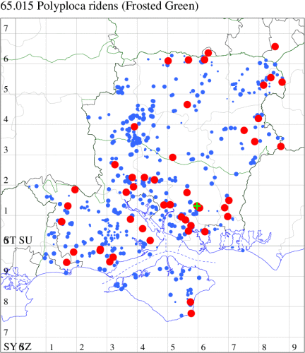 For the maps, all records prior to 2024 are shown by a blue dot (the larger the dot, the more recent), with the current year's records shown in red. As previous records are superimposed on any report for 2024, new sites have greater emphasis (i.e. will show as 'more red').