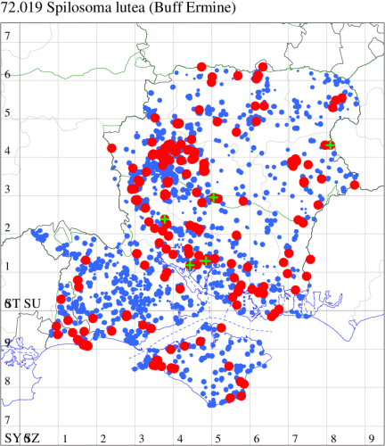 Common in open woodland, gardens and hedgerows, and on downland and sand-dunes throughout much of England, Wales and southern Scotland. In Hampshire and on the Isle of Wight widespread, but has declined recently. Wingspan male 30-35 mm, female 36-43 mm. The males are sometimes common at light, the females fly infrequently but are sometimes seen during the day. Male unmistakable, female is similar to White Ermine and Water Ermine, but smaller. Larva feeds on various herbaceous plants, including Dock and Dead-nettle, over-wintering as a pupa.