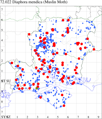For the maps, all records prior to 2024 are shown by a blue dot (the larger the dot, the more recent), with the current year's records shown in red. As previous records are superimposed on any report for 2024, new sites have greater emphasis (i.e. will show as 'more red').