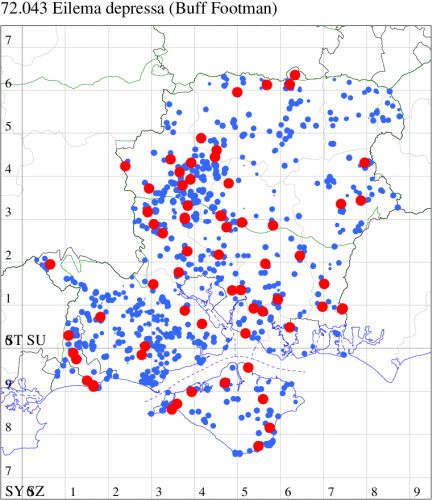 Common wherever there are lichens, in gardens, farmland, marshes and woodland throughout England, Wales and southern Scotland. Widespread and common in Hampshire and on the Isle of Wight. Wingspan 31-38 mm. Wing-shape and posture of live specimens is a far more reliable way of separating the various Eilema species than examination of prepared specimens, and familiarity with E. lurideola is the key to the identification of the other Eilema species; the most likely confusion species is Dingy Footman E. griseola, which see. Larva feeds mainly on various lichens, perhaps also on the foliage of various trees and bushes, including Hawthorn and Dogwood.