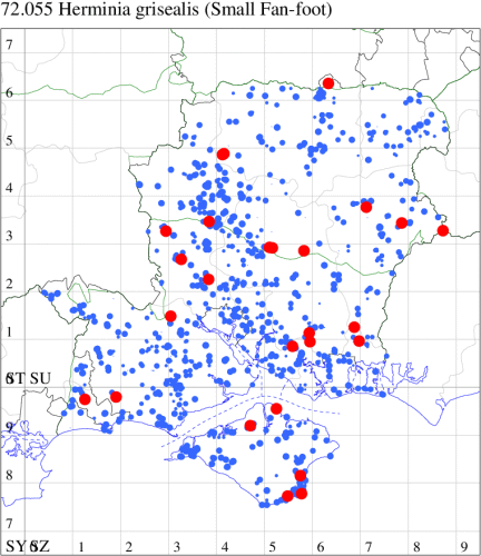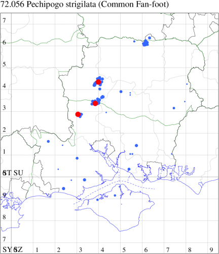 Nationally scarce (Na) in ancient deciduous woodland in parts of southern England, a priority species under the UK Biodiversity Action Plan. Still found in a few localities in its previous range which included most of England south of the Humber and parts of Wales. In Hampshire its decline mirrored the national trend and until recently was only reliably found in Pamber Forest, but in recent years has been found to have a relatively strong population in the Harewood Forest area. The only modern record from the Isle of Wight was a strong count of 22 in Parkhurst Forest in June 1988: it is therefore rather mystifying why it hasn't been reported from there since. Wingspan 32-34 mm. The most likely confusion species is the rare immigrant Jubilee Fan-foot Zanclognatha lunalis, which see for differences. Larva feeds on Pedunculate Oak.