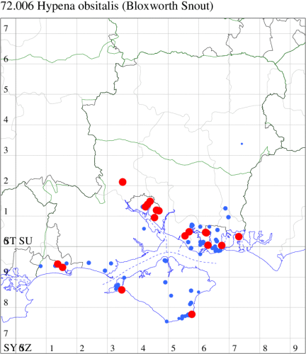 Nationally scarce (Nb) in hedgerows, woodland edges and gardens throughout much of south-eastern England, and a priority species under the UK Biodiversity Action Plan. In Hampshire and on the Isle of Wight very local, but since 1990 there does appear to have been an increase in the numbers reported, with a peak of 44 records in 2001. Wingspan 29-32 mm. The main confusion species is Bloxworth Snout H. obsitalis, which has the forewing more pointed and broader, with a conspicuous white patch below the costa outside the median fascia, followed by horizontal dashes (MBGBI Vol 10). Larva feeds on Hop.