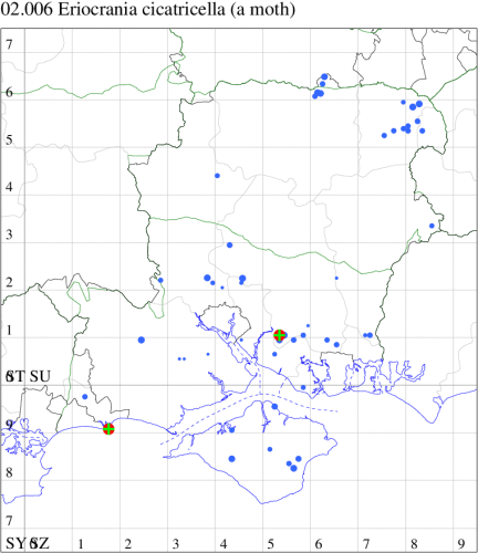For the maps, all records prior to 2024 are shown by a blue dot (the larger the dot, the more recent), with the current year's records shown in red. As previous records are superimposed on any report for 2024, new sites have greater emphasis (i.e. will show as 'more red').