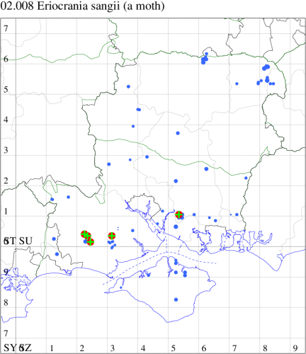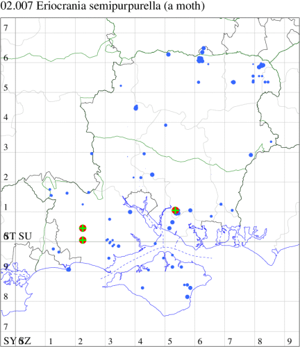 Common in birch woodland throughout the British Isles. Fairly widely distributed in Hampshire and on the Isle of Wight, where it is the most common of the six birch feeding Eriocrania species. Wingspan 9-14 mm. Day-flying. Very similar to E. sangii, from which separated only by dissection of the genitalia. Larva mines leaves of Birch, over-wintering as a pupa.