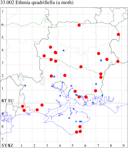 Local in woodland rides, fens and scrubland across much of southern England. In Hampshire still reasonably common along the M3 corridor from Chandler's Ford to Basingstoke, but rare elsewhere in the county and on the Isle of Wight. Wingspan 17-21 mm. The pattern of large spots on a pure white ground precludes confusion with other Ethmia species and the superficially similar Yponomeuta, as well as the much larger Thistle Ermine Myelois circumvoluta. Larva feeds on Common Gromwell, living within a silken web, and over-wintering as a pupa.
