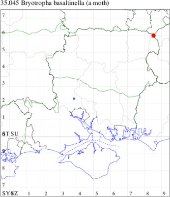 Nationally scarce (Na) in urban areas and on old buildings in southern England. First recorded in South Hampshire in 2013, and found on the Hampshire/Surrey border in North Hampshire in 2023. While occasionally reported, records are often unsupported by sufficient evidence to allow acceptance; it is probably under-recorded as very similar to B. dryadella and often only separable by dissection of the genitalia, however shape of fascia is straight or slightly inwards-bent in B. dryadella, but slightly outwards-bent and rarely straight in B. basaltinella (MBGBI Vol 4 part 2). Larva feeds on various mosses, living within a silken tube or tent.