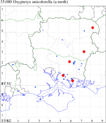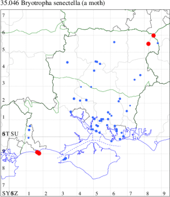 VC11: Ocknell Plain, NF, present, swept, several, 16 Aug; Pig Bush, NF, present, at dusk, 20 Aug; Hill Top, NF, 15, netted, 20 Aug (AMD); Hurn, one, 18 Aug (MJef);