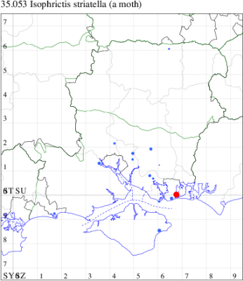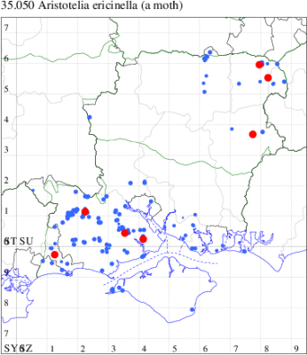 Local on heathland throughout England and Wales. In Hampshire fairly common on the heaths of the New Forest and the north-east, but very local elsewhere. Not recorded from the Isle of Wight since 1975. Wingspan 12-13 mm. Flies in afternoon, and occasionally comes to light. One of the more distinctive gelechiids, unlikely to be confused with any other species. Larva feeds on Heather, living between shoots spun together with silk, and over-wintering as an egg.