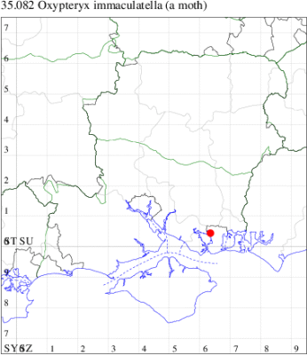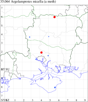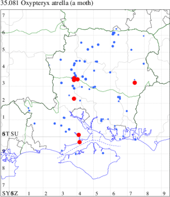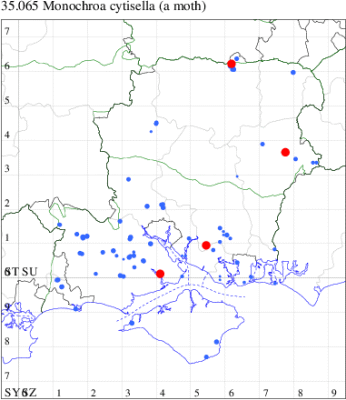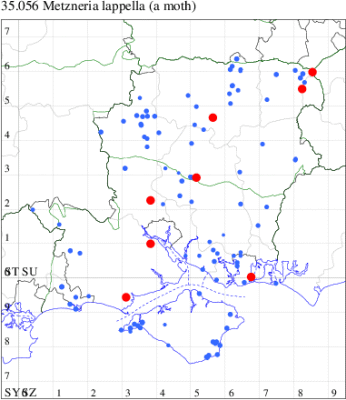 VC12: Barton Stacey, one, 09 Jul (GCE); Morn Hill, Winchester, one, 10 Jun (CRB, DAS, PDF et al); one, 10 Jun (CRB, PDF, DAS, LHur); two, 24 Jun (CRB, PDF, DAS); one, 28 Jul (CRB, PDF, DAS, LHur); Overton, one, 09 Jun; one, 05 Sep; one, 08 Sep (ACr); Tidgrove Warren, nr Overton*, one, 07 Jul (MJW, ACB); Noar Hill HIWWT NR, Selborne, two, 1f gen. det., 09 Jun (AMD, FHay det. AMD)