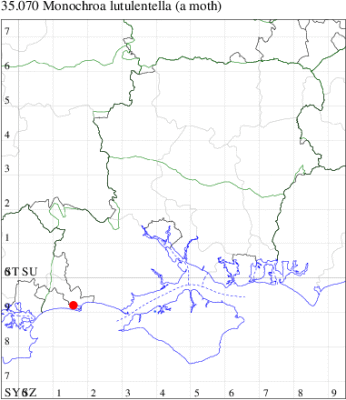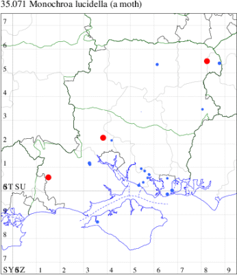 Nationally scarce (Nb) in waste ground, dry pastures and sand-dunes, south-east of a line from Somerset to Norfolk (MBGBI Vol 4 part 2). In Hampshire the main population is found in the south of the county, notably at Southsea, Funtley and Lower Test Marshes, where first confirmed for Hampshire in 1992; there is one record from the north of the county, at Bramley Frith Wood in 1999, and a few from the Isle of Wight, after the first at Cranmore in 1997. Wingspan 15-19 mm. Larva feeds within roots and lower stems of Curled Dock and Dock, over-wintering as an egg or small larva.