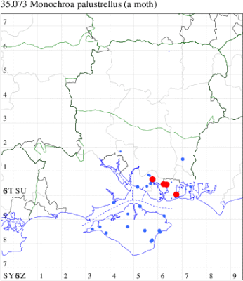 Local in marshes, water meadows, fens and by river-banks throughout much of England, Wales and southern Ireland. In Hampshire the main population is centred in the south-east of the county in and around Fareham, Southsea, Botley Wood and along the west side of Langstone Harbour; in the north of the county, recorded recently only from the Deadwater Valley, formerly known from Alice Holt and Itchen Abbas. Not recorded from the Isle of Wight to date. Wingspan 12-14 mm. Larva feeds within stems of Common Spike-rush.