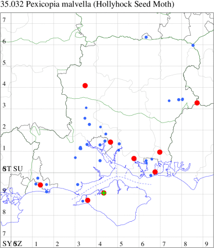 Nationally scarce (Nb) in rough ground and gardens in parts of southern England. In Hampshire recorded frequently and in numbers along the south-east coastal strip. Inland, and on the Isle of Wight, there are only scattered records. Wingspan 16-18 mm. The larva feeds on flowers and seeds of Common Mallow and Hollyhock.