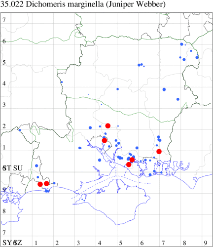Local on chalk and limestone downland, and, on cultivated forms of the foodplant, in gardens throughout much of England; also in South Wales and on the Burren. In Hampshire most likely to be encountered in the south-east and the extreme north-east of the county, and largely absent from the New Forest and much of north Hampshire. On the Isle of Wight, known only from Freshwater, where first recorded in 1989, and again in 1995 and 1996. Wingspan 15-17 mm. Unmistakable. Larva feeds within needles of Juniper, subsequently living within a silken web.