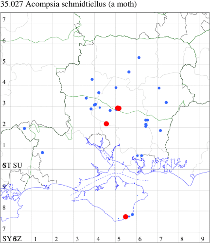 Nationally scarce (Nb) on chalk and limestone downland and roadside verges in southern England and south Wales. Restricted in Hampshire to sites such as Old Winchester, Portsdown and Magdalen Hill Down, and on Isle of Wight to a single site near Ventnor; claims from other areas of the county should be accompanied by photographic or other evidence. Wingspan 15-17 mm. Larva feeds on Wild Marjoram, living within a spun or rolled leaf.