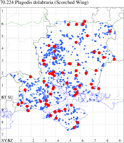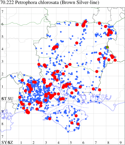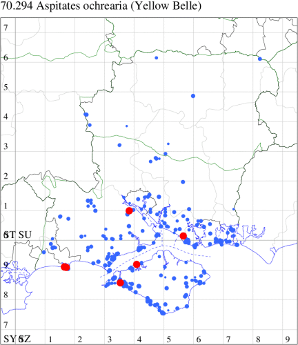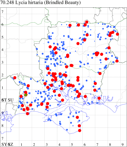 VC11: Broughton, two, 29 Jul; two, 29 Jul; Ashley, two, 07 Aug; Little Somborne, one, 09 Aug (GCE); Sparsholt Equine Centre, one, field obs., 24 Aug (VWalk det. Unkn.); Brownwich Cliffs, Titchfield, three, 26 Jul; five, 16 Aug (F.M.G.); Funtley, one, 23 Jul (TDC); Fareham, one, 22 Jun; one, 26 Jun (ADT); Botley, one, 13 Aug (SLB); Dean, Bishop's Waltham, present, 21 Jun; present, 25 Jun; present, 29 Jun; present, 13 Jul; present, 18 Jul; present, 30 Jul; present, 01 Aug; present, 12 Aug (CMor); Bishops Waltham, one, field obs., 23 Aug; Dundridge, one, field obs., 17 Jul (DTru); Wickham, one, 28 Jun (JRDS); Portchester, one, 24 Jun (DH-J); Portsmouth, one, 19 Jul (IRT); Lovedean, one, 17 Jun; one, 18 Jun; one, 22 Jun; one, 23 Jun; one, 25 Jun; one, 26 Jun (ARJa); Hurn, one, 31 Jul; one, 01 Aug; two, 02 Aug (MJef); Hengistbury Head NNR, one, 07 Aug (HengistH det. MJef); one, 09 Aug (BKin det. MJef); three, 12 Aug (MoTay det. MJef); one, 14 Aug (RPH); Hengistbury Head, nine, 30 Jul (MJef); Burton, nr Christchurch, one, 30 Jul (JStw); Browndown, one, 09 Aug (F.M.G.);