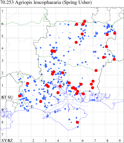 For the maps, all records prior to 2024 are shown by a blue dot (the larger the dot, the more recent), with the current year's records shown in red. As previous records are superimposed on any report for 2024, new sites have greater emphasis (i.e. will show as 'more red').