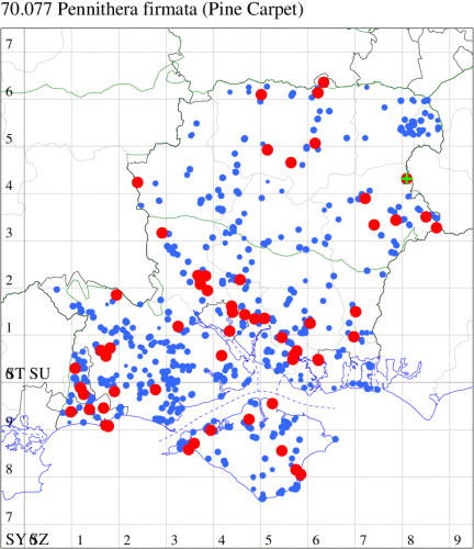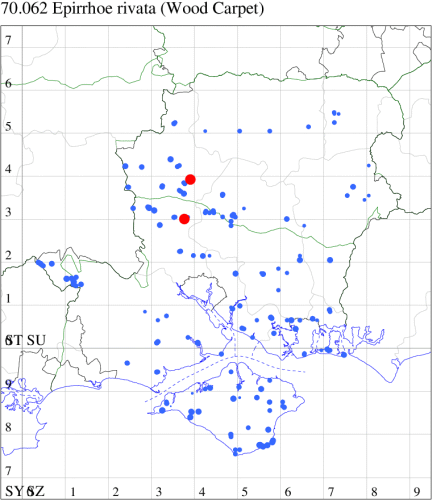 Common in gardens, woodland, hedgerows, downs, fens, moors and sand-dunes throughout the British Isles, a species of conservation concern under the UK Biodiversity Action Plan. Widespread and common in Hampshire, but rather scarce on the Isle of Wight, with just four records there so far this century. Wingspan 24-27 mm. Very similar in form to Red Twin-spot Carpet X. spadicearia, which see; the red form, which has yet to be reliably identified from Hampshire, should be treated as indistinguishable without dissection of the genitalia. Larva feeds on Bedstraw, Ground-ivy and Dock, over-wintering as a pupa.