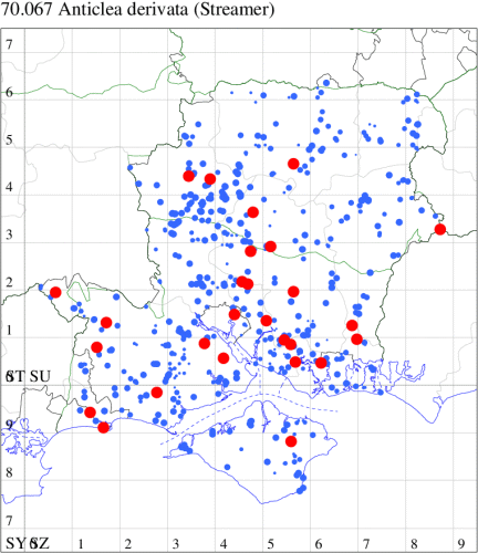 VC11: Marchwood, one, 11 Aug (CTha); Woodlands, NF, one, 01 Aug (RBW); Cromarty Pond area, Lord's Hill, one, 12 Jul; one, 18 Jul (JClx); North Baddesley, one, 17 Jul; two, 19 Jul (RWPas); East Tytherley, one, 27 Jul (GCE); Mottisfont Abbey NT, nr Romsey, one, 01 Jul; one, 17 Jul; one, 23 Jul (TSto); Romsey, one, 23 Jul; present, 24 Jul; one, 30 Jul; one, 31 Jul (SRC); Fishlake Meadows, one, 12 Aug (NRJ); Romsey, one, 18 Jul; one, 23 Jul; two, 11 Aug (MJB); one, 22 Jul; two, 30 Jul (NRJ); Ashley, one, 13 Jul (GCE); Swaythling, Southampton, present, 30 Jul (MEdg); Southampton, one, 26 Jul (MGP); Itchen Valley CP, four, 19 Jul (CTha); Itchen Valley C.P., three, 19 Jul (F.M.G.); Allbrook, one, 07 Jun; three, 11 Jul; one, 28 Jul; one, 05 Aug; one, 10 Aug; one, 11 Aug; Highbridge, Eastleigh, one, 02 Aug (SIng); Brownwich Cliffs, Titchfield, one, 26 Jul (F.M.G.); Stubbington, one, 30 Jul (DPH); Funtley, one, 11 Jul (TDC); Fareham, one, 16 Jul (ADT); Dean, Bishop's Waltham, present, 30 Jul (CMor); Wickham, two, 29 Jul; two, 30 Jul; three, 02 Aug (JRDS); Portsmouth, one, 11 Jul (IRT); Waterlooville, one, 15 Aug (DWhe); Old Winchester Hill, one, 30 Aug (F.M.G.); Horndean, one, 12 Jul (PHog); Stroud, Petersfield, two, 19 May; two, 27 Jul (RAll); Muscliffe, one, 19 Jul (CMur det. CMur,MLan); Merritown Heath, one, 29 Jun (DFoo); Hurn, one, 12 Aug (MJef); Christchurch: Cross Way, one, 12 Jul (LPyk); Burton, nr Christchurch, one, 16 Jul; one, 30 Jul (JStw);