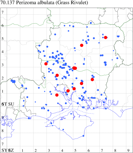 Local on calcareous grassland, sand-hills and coastal shingle throughout the British Isles, a species of conservation concern under the UK Biodiversity Action Plan. Local on good quality grassland, particularly on the downs, in Hampshire but quite rare in the Isle of Wight. Wingspan 20-26 mm. Paler than most Perizoma species, and lacking the two dark spots on the sub-terminal fascia of Twin-spot Carpet P. didymata. Larva feeds on seeds of Yellow-rattle, over-wintering as a pupa.