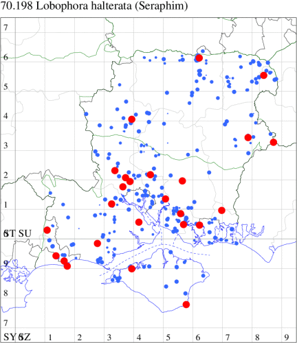 VC11: Brockwood, one, 30 May (SDut); Blashford Lakes HIWWT NR, two, 16 Jul; one, 21 Sep (PWhtk); one, field obs., 14 May (GLes); two, 16 Jul (PWhtk); Romsey, two, 11 Aug (NRJ); Bevois Valley, Southampton, one, 10 Aug (MCrei); Allbrook, one, 15 May; one, 21 Jul; one, 17 Aug (SIng); Brownwich Cliffs, Titchfield, one, 16 Aug (F.M.G.); South Holt Farm, NF, one, 28 Aug (CGree det. OHen); Merritown Heath, present, 17 Aug (DFoo); Browndown, three, 09 Aug (F.M.G.);