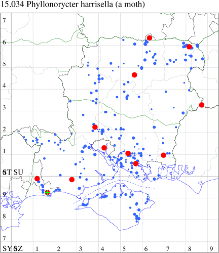 For the maps, all records prior to 2024 are shown by a blue dot (the larger the dot, the more recent), with the current year's records shown in red. As previous records are superimposed on any report for 2024, new sites have greater emphasis (i.e. will show as 'more red').