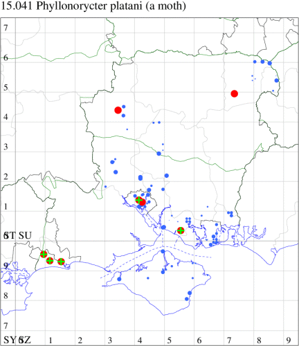Local in parks and urban areas, discovered new to Britain in London in 1990, since when it has spread through the southern counties of the UK and has reached the West Country and Midlands. Found in Hampshire for the first time in 1998 in Southampton and on the Isle of Wight in 2004, becoming more frequent and widespread. Wingspan 9-10.5 mm. Imago seldom encountered at light, and more likely to be recorded in the larval stage, when mines are relatively easy to find where they are present. Larva mines leaves of London Plane in late autumn and are large and obvious, one leaf often hosting several, over-wintering as a pupa in a cocoon.