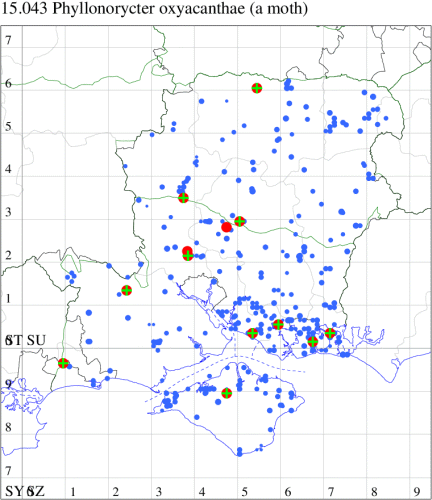 VC11: Fritham, NF, mine, present, crataegus, 13 Oct (JOug); Baddesley Common, mine, present, 05 Oct (AMD); Romsey, two, to pheromone lure, 1 to NIG and 1 to APR lures, 06 Apr; one, to pheromone lure, to NIG lure at 12.00 - gen det, 09 Apr (NRJ); Winchester, one, 12 Apr (THW); Titchfield Haven NNR, mine, 20, on Hawthorn, 25 Aug (DPH); Cams Bay, Fareham, mine, present, 08 Sep; Milton Common, mine, present, 03 Oct; Hayling Oysterbeds, mine, present, on Crataegus & Pyrus, 19 Oct; Stour Valley NR, mine, present, 24 Aug (AMD);