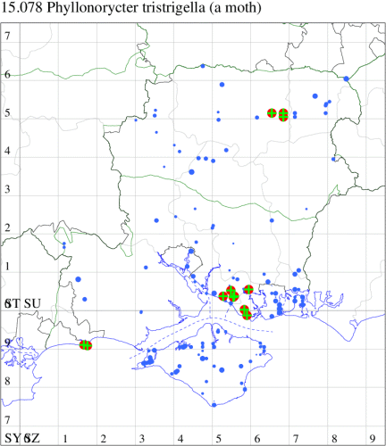 Common in damp woodland throughout much of England and Wales, and parts of western Scotland. Probably under-recorded in Hampshire or on the Isle of Wight, where the extent of known records correlate with those areas in which the recording effort is concentrated. Wingspan 6.5-7.5 mm. Imago similar to P. tristrigella, P. froelichiella, P. nicellii and P. kleemannella, but the only one of the group to have a blackish brown vertical tuft on the head. P. stettinensis may also be distinguished by its short basal streak; P. tristrigella usually has a pale basal spot, but the other species no indication even of this (MBGBI Vol 2). Imago seldom encountered at light, and more likely to be recorded in the larval stage, when mines are relatively easy to find where they are present. Larva mines leaves of Alder, over-wintering as a pupa in a cocoon.