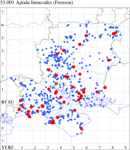 VC11: Brockwood, one, 21 Jun (SDut); Marchwood, one, 01 Jul (TDCh); one, 11 Jul; one, 16 Jul; one, 18 Jul (CTha); Woodlands, NF, one, 24 Jun (RBW); Cromarty Pond area, Lord's Hill, one, 09 Jul; one, field obs., 10 Jul; larva, one, field obs., 18 Sep (JClx); Mottisfont Abbey NT, nr Romsey, one, 12 Jul (TSto); Romsey, one, 20 Jun; one, 03 Jul (NRJ); Dibden Purlieu, one, 25 May; one, 09 Jul; Dibden Purlieu, NF, one, 11 Jul; one, 11 Jul; one, 12 Jul (RAC); Blackfield, four, 25 Jun (SJJ); Allbrook, one, 24 Jun; two, 26 Jun; one, 10 Jul; one, 11 Jul; Highbridge, Eastleigh, five, 25 Jun (SIng); Stubbington, one, 25 Jun (DPH); Funtley, four, 25 Jun; two, 26 Jun; two, 29 Jun; two, 11 Jul; one, 13 Jul; one, 19 Jul; one, 20 Jul (TDC); Fareham, one, 01 Jul (ADT); one, 29 Jun; one, 10 Jul; two, 17 Jul (MLO); Pigeon House Coppice, Boarhunt, one, 12 Jul (F.M.G.); Botley, one, 23 Jun (SLB); Wickham, two, 25 Jun; one, 26 Jun; one, 30 Jul (JRDS); Upham, one, 15 Jun (F.M.G. det. RJD); Waterlooville, one, 25 Jun; one, 30 Jun; one, 04 Jul; seven, 07 Jul; three, 10 Jul; one, 15 Jul; one, 17 Jul; one, 11 Aug (DWhe); South Holt Farm, NF, one, 12 Jul (CGree det. OHen); Muscliffe, one, 19 Jul (CMur det. CMur,MLan); Merritown Heath, one, 29 Jun (DFoo); Burton, nr Christchurch, one, 15 Jun (JStw); Stanpit Marsh LNR, one, 22 Jun (PAB); Hengistbury Head, one, 26 Jun (MJef); St Georges Drive, Bransgore, two, 29 Jun (SPMC); New Milton, two, 23 Jun (RPH); Sway, one, 03 Jun; two, 24 Jun; one, 09 Jul; one, 11 Jul; two, 31 Jul (SKee); Sway, NF, two, 23 Jun (DMui);