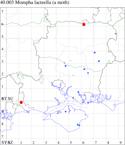 Local in open woodland, waste ground and gardens throughout Britain, north to Aberdeenshire. In Hampshire recorded widely in both vice-counties, but there are no recent records from the Isle of Wight. Wingspan 11-12.5 mm. The main confusion species is M. lacteella from which it is distinguished by the white head and thorax and on the forewing by the white basal blotch and brown terminal area (MBGBI Vol 4 part 1). Larva mines leaves of Broad-leaved Willowherb and Great Willowherb, over-wintering as a small larva.