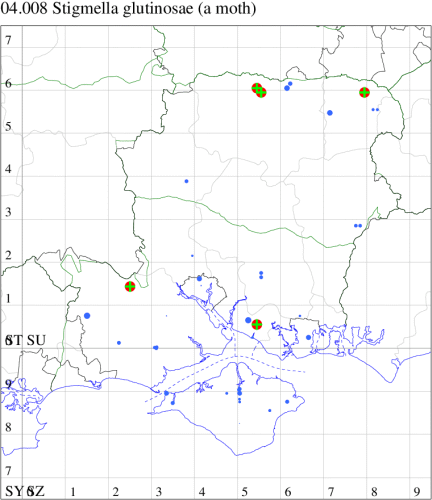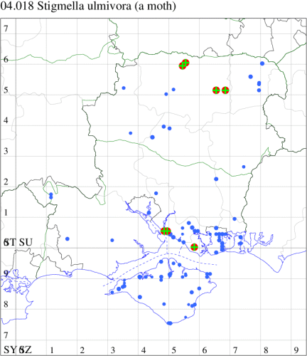 Local throughout much of England, as far north as Durham. In Hampshire very rare away from the extreme south-east of the county; on the Isle of Wight, common and widespread. Wingspan 4.8-5.6 mm. Larva mines leaves of Elm, over-wintering as a pupa.