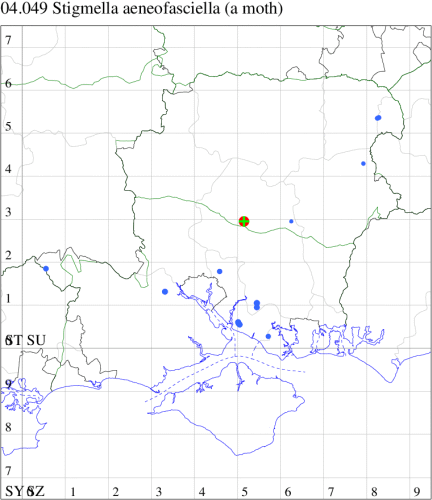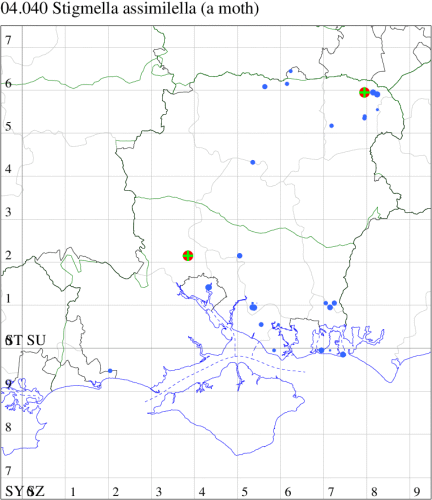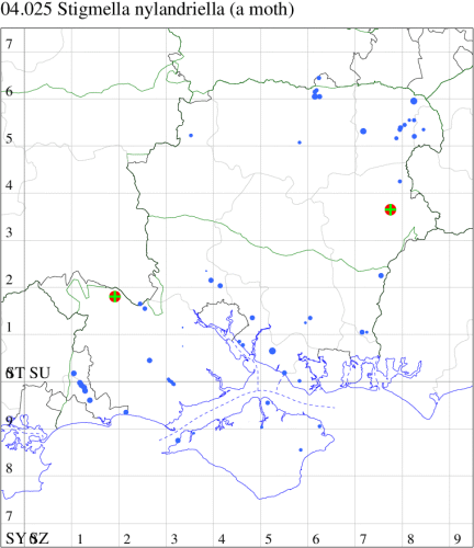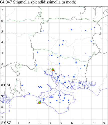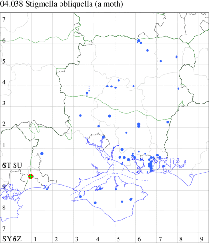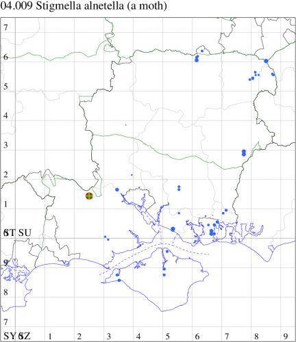 Local in southern and central Britain. in damp woodland and marshes, and on river-banks. In Hampshire and on the Isle of Wight thinly scattered in the south of the county, such as at Roydon Woods HWT reserve, and on the Island, but very rare in the north of the county. Adults difficult to distinguish from other Stigmella species, and all records require gen det to be accepted. Wingspan 4.4-5.2 mm. Larva mines leaves of Alder, over-wintering as a pupa. The mines are similar to those of S. alnetella and are described in the following link: