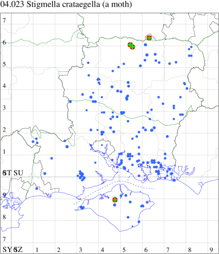 Common in hedgerows, parks and gardens throughout the British Isles. In Hampshire and on the Isle of Wight widespread and locally common, but doubtless under-recorded. Wingspan 5-6.5 mm. Imago has plain bronze forewing, tinged green on the inner two-thirds and red towards the tip (MBGBI Vol 1), but can be separated from similar Stigmella species only by dissection of the genitalia. Most frequently recorded as a larval miner of the leaves of Cultivated Rose and Wild Rose, over-wintering as a pupa. However, the mine very similar to that of S. centifoliella and records of vacated mines, although reported here, should be treated with caution.