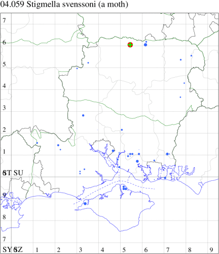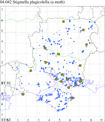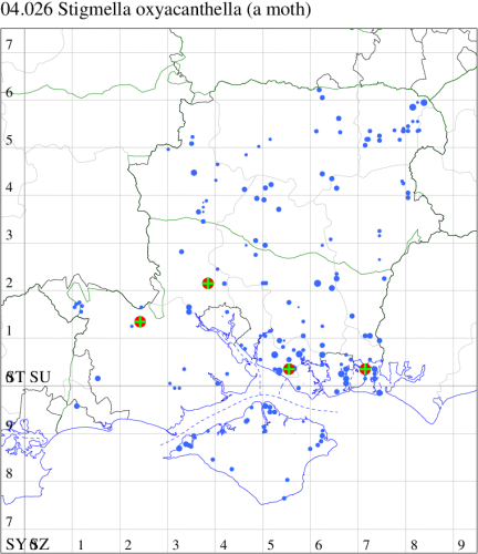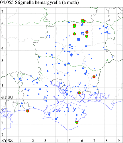 For the maps, all records prior to 2024 are shown by a blue dot (the larger the dot, the more recent), with the current year's records shown in red. As previous records are superimposed on any report for 2024, new sites have greater emphasis (i.e. will show as 'more red').