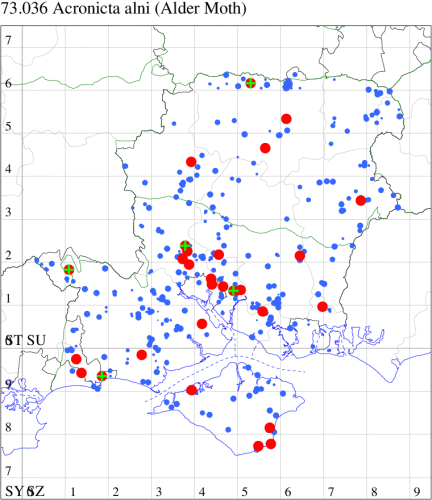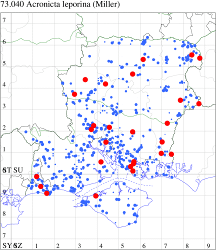 Common on grassland, heathland, marshes, gardens and a wide range of other habitats throughout much of the British Isles. In Hampshire and on the Isle of Wight widespread and common in all three vice-counties. Wingspan 35-43 mm. Superficially similar to other Acronicta species, it can usually be distinguished by the curved white mark near the rear edge of the forewing, which is normally present even in melanic specimens. Larva feeds on various herbaceous and woody plants, including Broad-leaved Dock, Common Sorrel, Ribwort Plantain, Greater Plantain, Water Mint, Bramble, Hop, Hawthorn and Burnet Rose, over-wintering as a pupa.