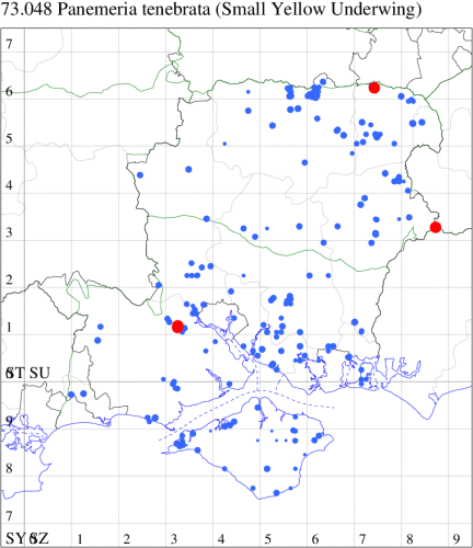 VC11: St Catherine's Hill, Winchester, larva, present, field obs., 18 Sep (IPow); Fareham, larva, one, field obs., 29 Jun; larva, one, field obs., 11 Aug (ADT);