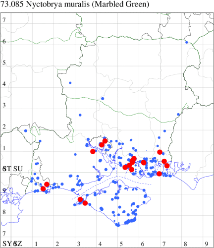 Common in orchards and woodland, and around old buildings, dry-stone walls and sea cliffs throughout the British Isles. Historically widespread and common in Hampshire and on the Isle of Wight, the 21st century has seen a significant decline in reporting rates: based on records received 2000-2023 this decline is in the region of 80-90%. The reason for this is unclear but may be at least in part due to competition with Tree Lichen Beauty which has increased dramatically in the same timeframe.Wingspan 23-31 mm. Dentate antemedian fascia extends from costa to dorsum, in contrast to superficially similar Marbled Green C. muralis, in which antemedian fascia falls short of dorsum. Larva feeds on various lichens, often on walls and tree trunks.