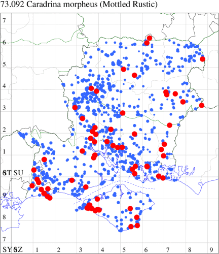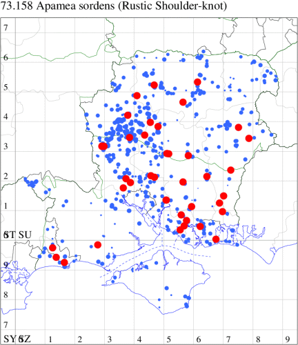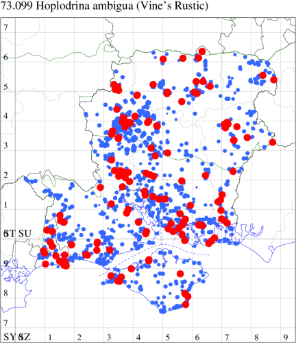 Following an expansion in range and numbers in recent decades, now common in grassland, heathland, woodland rides and gardens throughout southern England and Wales, north to southern Scotland. Widespread and common in Hampshire and on the Isle of Wight. Wingspan 27-34 mm. The main confusion species are Uncertain H. alsines and Rustic H. blanda, but less variable and often slightly smaller than these species, generally rather pale grey-brown, with relatively large orbicular and reniform stigmata, usually slightly darker than the ground colour, and usually distinctly white-edged. Larva feeds on various herbaceous plants, including Dandelion, Greater Plantain, Ribwort Plantain, Primrose and Prickly Lettuce.