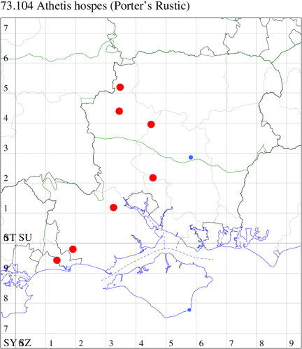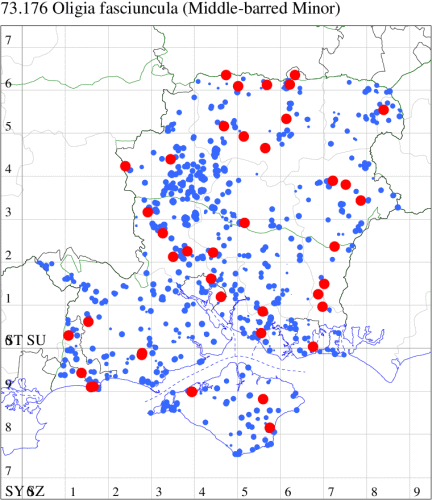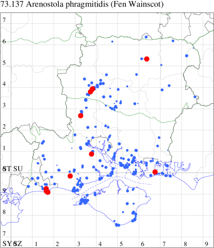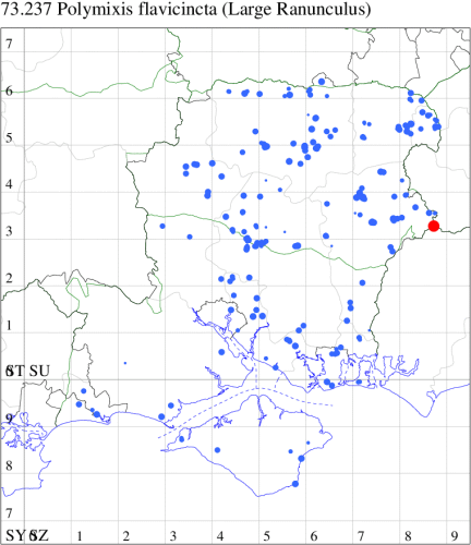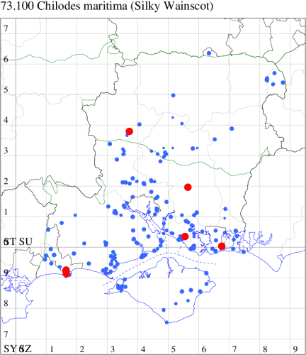VC11: Stubbington, one, 30 Jun (WMay); Lee-on-Solent, one, 29 Jun (IHrg); Fareham, one, 27 Jun; one, 29 Jun; one, 01 Jul (ADT); one, 25 Jun (IMcP); Botley, one, 25 Jun (SLB); Christchurch: Cross Way, one, 20 Jul (LPyk); Hengistbury Head NNR, one, 27 Jun (MoTay det. MJef); two, 04 Jul (BKin det. MJef); one, 10 Jul (HengistH det. MJef); two, 11 Jul; one, 14 Jul (BKin det. MJef); one, 16 Jul (HengistH det. MJef);