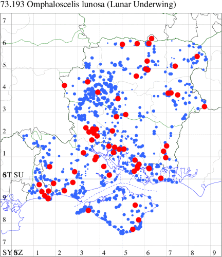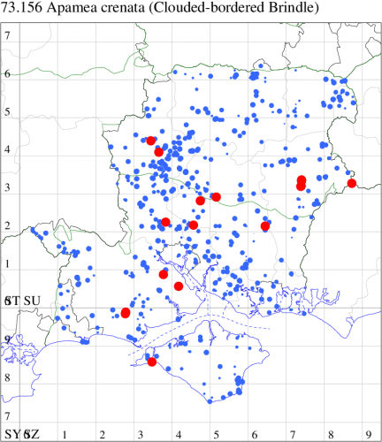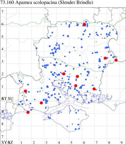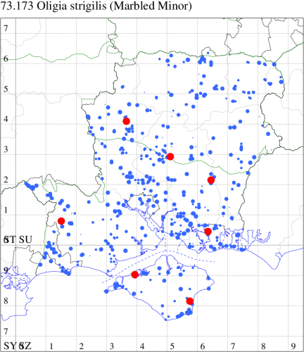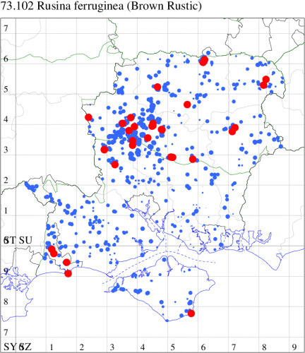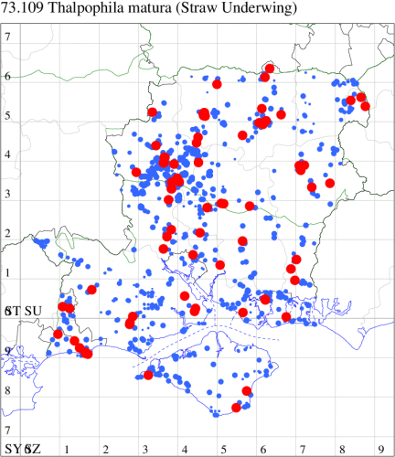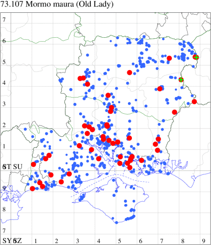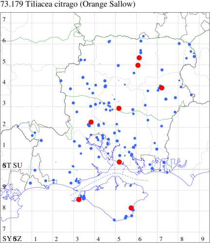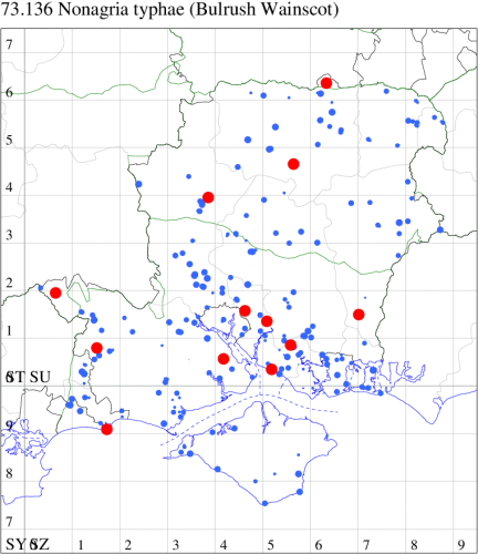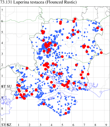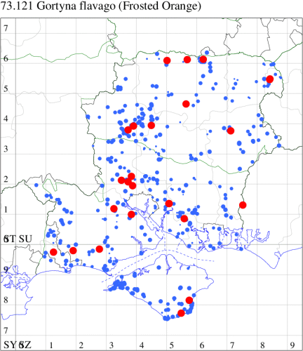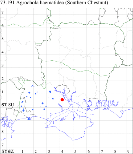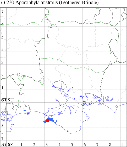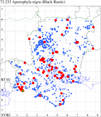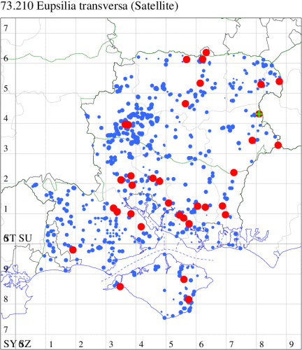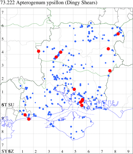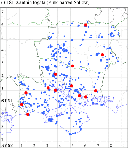 VC11: Marchwood, one, 19 Sep; one, 01 Sep; two, 06 Sep; one, 08 Sep (CTha); Woodlands, NF, one, 31 Aug (RBW); Lee, two, 06 Sep (CTha); Romsey, three, 01 Sep; five, 02 Sep; present, , 03 Sep (SRC); two, 30 Aug; three, 01 Sep; two, 03 Sep; one, 08 Sep; one, 16 Sep; one, 19 Sep (MJB); one, 01 Sep (NRJ); Stockbridge Down NT, one, 28 Aug (GCE); Dibden Purlieu, one, 28 Aug; Dibden Purlieu, NF, one, 01 Sep; one, 02 Sep; one, 07 Sep (RAC); Southampton, one, 19 Sep (MGP); West End, one, 01 Sep (AMD); Allbrook, two, 01 Sep; two, 02 Sep; one, 08 Sep; two, 20 Sep (SIng); Brownwich Cliffs, Titchfield, four, 06 Sep (F.M.G.); Funtley, four, 01 Sep (TDC); Fareham, one, 02 Sep; one, 08 Sep; one, 15 Sep (MLO); Botley, one, 01 Sep; one, 03 Sep; one, 13 Sep (SLB); Waterlooville, one, 08 Sep; seven, 06 Oct (DWhe); Northney, Hayling Island, present, 02 Sep; present, 13 Sep (JWP); Hurn, two, 11 Sep (MJef); Sway, one, 26 Aug; three, 01 Sep; one, 03 Sep; one, 08 Sep; two, 09 Sep (SKee); Sway, NF, present, 01 Sep (DMui); Pennington, one, 31 Aug; one, 06 Sep; two, 07 Sep; one, 20 Sep; one, 22 Sep (RFC);