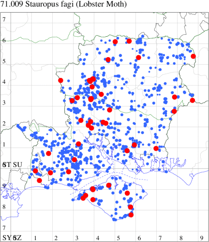 Common in mature woodland throughout much of southern England. In Hampshire and on the Isle of Wight widespread and fairly common in beech woodland, and at a lower frequency in oak or birch, especially in the New Forest. Wingspan 55-70 mm. Unmistakable with a distinctive resting posture. Larva feeds on Birch, Hazel, Oak and Beech, over-wintering as a pupa.