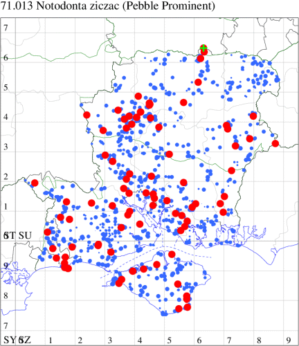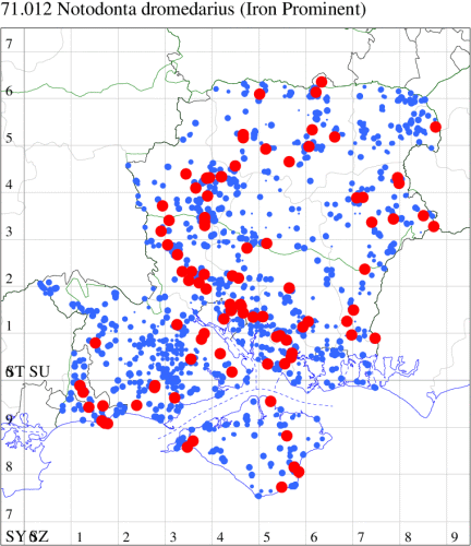 Common in woodland, hedgerows and gardens throughout the British Isles. Widespread and common in Hampshire and on the Isle of Wight. Wingspan 42-52 mm. Could be confused with the very rare immigrant Three-humped Prominent N. tritophus, which see. Larva feeds on Sallow and Willow, over-wintering as a pupa.